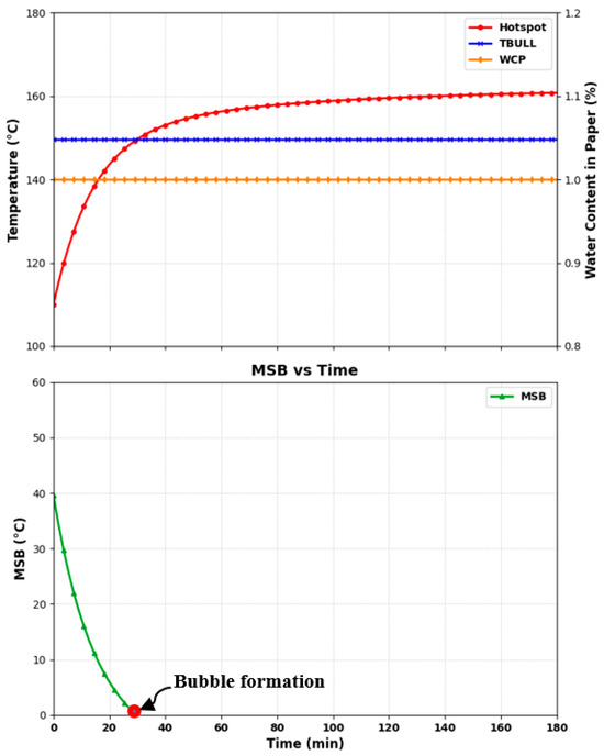 Figure 14 focuses on scenarios with a constant WCP. In contrast, Figure 15 examines scenarios with variable WCP, highlighting the dynamic impact of fluctuating moisture levels on bubble formation in the transformer insulation system. Both figures start with a load of 1.089 p.u, corresponding to an initial hot-spot temperature of 110 °C, which progressively rises due to the step-load increase. The critical moment of bubbling is indicated by MSB = 0.