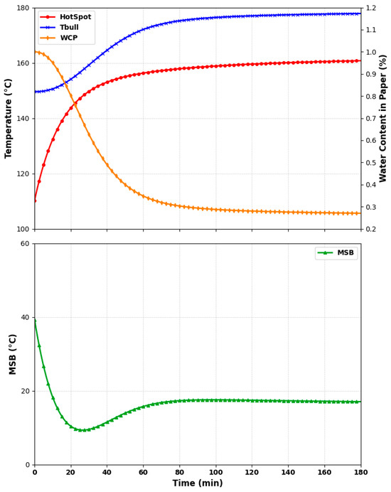 Modeling of hot-spot temperature, BIT, WCP, and MSB over time under variable WCP conditions.