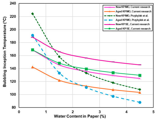The BIT was measured across different water content levels in paper samples immersed in MO and SE for each insulating quality (unaged or aged). The methodology involved controlled hydration of paper samples and subsequent BIT testing, as described in the Methodology section. WCP have been varied to reach several samples with different moistures inside. To this end, new and 2, 4, and 6 week aged mineral oil-impregnated paper with varying WCP were investigated. In addition to moisture in paper, aging is a significant factor influencing bubble formation, for that the effects of paper and oil degradation on BIT for both MO and SE are investigated. BIT is determined for four aging conditions.