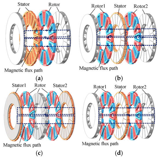 Motor models with different topologies: (a) SSSR structure; (b) SSDR structure; (c) DSSR structure; (d) YASA structure.