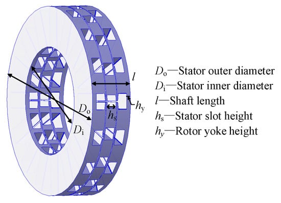 Given the unique characteristics of the AFEESM, including its multi-dimensional stator and rotor combinations, flat structure, and double-sided winding excitation, particular attention must be paid to the corresponding pole–slot combination, axial length-to-diameter ratio, and spatial allocation between stator and rotor in its design. To determine the motor’s optimal structure, this section investigates the influence of key parameters on motor performance and presents the design method and procedure for this type of motor.