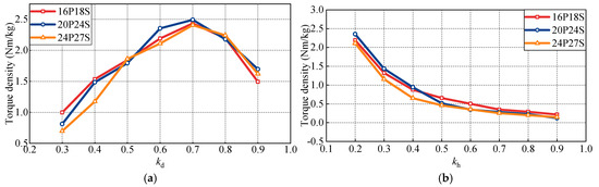 Influence of design parameters on torque density under different pole–slot combinations. (a) Influence of inner-to-outer-diameter ratio kd on torque density. (b) Influence of shaft-to-outer-diameter ratio kh on torque density.