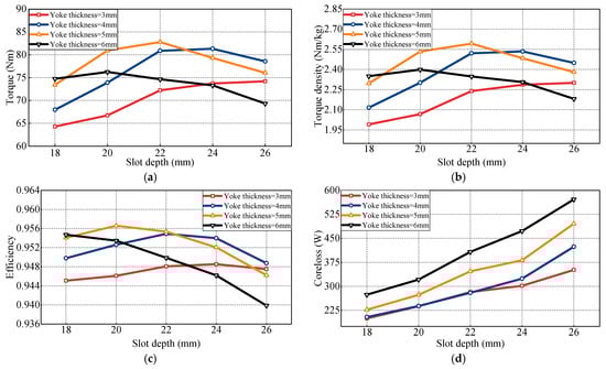 Influence of stator slot depth and rotor yoke thickness on motor performance: (a) torque; (b) torque density; (c) efficiency; (d) core loss.