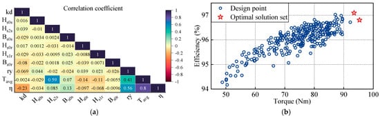 The correlation coefficient matrix is shown in Figure 7a. For average torque, a positive correlation is observed between stator slot depth and rotor yoke thickness. In the efficiency analysis, inner diameter and rotor yoke thickness are identified as key influencing factors, with the inner diameter exhibiting a negative correlation with efficiency. The distribution of the simulation-based optimization results is illustrated in Figure 7b, and a comparison of motor parameters before and after optimization is provided in Table 5.