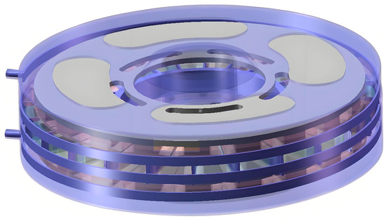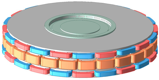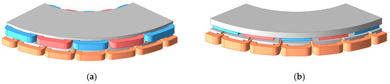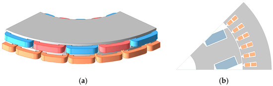 Similarly, under identical dimensions, the proposed novel motor is compared with an axial flux PMSM, maintaining the same pole–slot combination and current density. The model is shown in Figure 14.