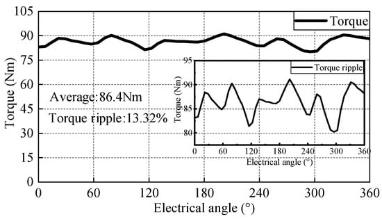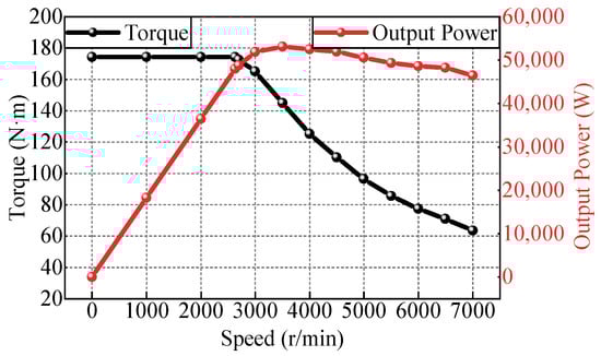 Under rated three-phase symmetrical AC excitation for the armature winding and rated DC excitation for the field winding, the torque output characteristic is shown in Figure 10. The average electromagnetic torque reaches 86.4 Nm with a torque ripple of 13.32%, satisfying the rated performance requirements. Furthermore, the simulated torque-speed (T-n) and power-speed (P-n) characteristics are shown in Figure 11. The corner speed is approximately 2600 r/min. The motor exhibits minimal power drop-off during speed escalation and maintains a high power output even at nearly triple the base speed.