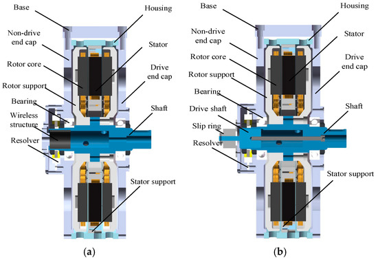 Schematic diagram of the motor overall structure: (a) overall structure of the integrated wireless excitation module; (b) overall structure of the traditional slip-ring type.