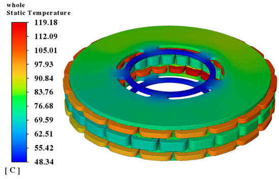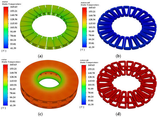 As the cooling water channels are integrated into the internal structure of the stator support frame and directly contact the stator windings, the stator region exhibits significantly lower temperatures compared to the rotor, as shown in Figure 18. The maximum stator winding temperature is 52.21 °C, while the rotor winding reaches a peak temperature of 165.63 °C.