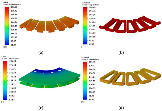 Stator and rotor temperature distribution under air cooling: (a) stator core; (b) stator winding; (c) rotor core; (d) rotor winding.