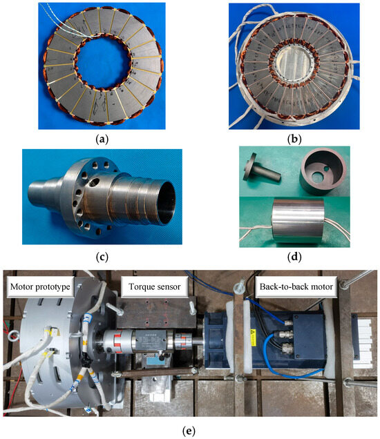 Prototype of the novel axial flux electrically excited motor: (a) rotor core; (b) stator core; (c) shaft; (d) wireless excitation structure; (e) experimental test bench.