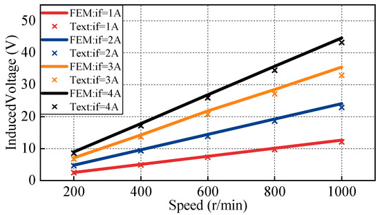 An in-shaft wireless power supply device was used to supply the field winding for testing the motor’s no-load back EMF characteristics. Figure 23 shows the experimental waveforms of the wireless excitation system at field currents of 1 A and 4 A. Channel 1 shows the transmitter-side current (Ip); Channels 2 and 3 correspond to the receiver-side current (Is) and voltage (Us), respectively; and Channel 4 displays the output field current (If). The results confirm that excitation current can be linearly regulated by adjusting the front-stage voltage amplitude, meeting the dynamic requirements of the excitation system under varying operating conditions. Additionally, with excitation currents of 1 A, 2 A, 3 A, and 4 A, the rotor speed was linearly increased from 200 r/min to 1000 r/min. As shown in Figure 24, the measured back-EMF results closely match the simulation, particularly in the low-speed range. While slight deviations emerge at higher speeds, they remain within acceptable limits.