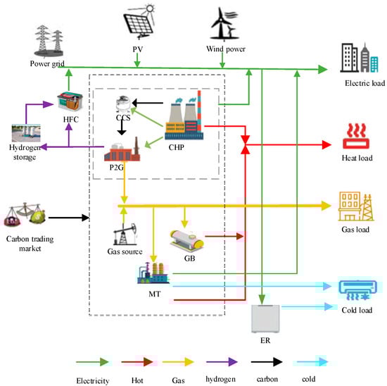 Figure 1. The electricity generation component comprises photovoltaic (PV) modules, wind turbines, micro gas turbines (MT), and combined heat and power units. The energy conversion devices encompass power-to-gas systems, gas boilers, electric chillers, and hydrogen fuel cells. On the energy storage side, there is a hydrogen storage tank, while the demand side reflects the requirements for electrical, thermal, gas, and cooling loads. Among them, the gas required for gas boilers, micro gas turbines and other gas applications is provided by electricity-to-gas systems as well as external natural gas pipelines. Among them, the P2G equipment supplies the converted methane gas to the MT, GB and gas loads, and purchases methane through the external gas network when the weather demand is high.