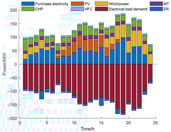 Table 3. Scenario 1 excludes the integrated operation of carbon trading schemes and the CCP. Building upon Scenario 1, Scenario 2 introduces a carbon trading mechanism that incorporates both incentives and penalties. Scenario 3 introduces CCS and P2G on the basis of Scenario 1, that is, it considers the joint operation of CCP units. Scenario 4 is the optimization strategy considered in this paper.