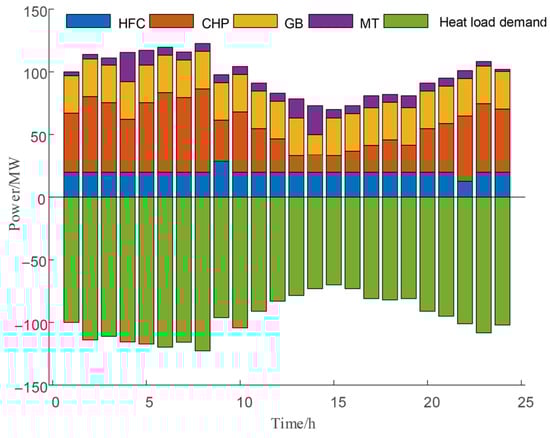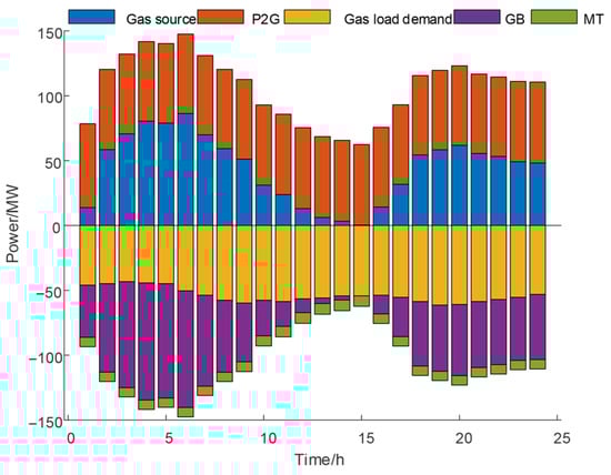 In the formula, is the thermal power generated by the gas boiler, in MW; represents the gas consumption power of the boiler, in MW; represents the efficiency of the gas boiler; and and are the limits of the thermal power of the GB, in MW.