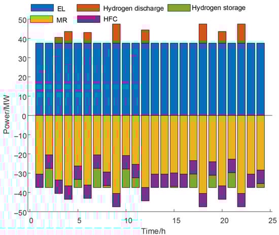 In the formula, and are the charge and discharge powers of the hydrogen storage tank, respectively, in MW; and and are the upper and lower limits of the hydrogen storage tank capacity, respectively.