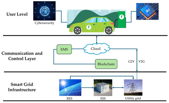 In particular, the architecture must adequately address the dual functionality of charging EVs and providing energy back to the grid. This requires advanced power management systems capable of ensuring energy quality and reliability while accommodating the high variability associated with RESs [25]. Such challenges necessitate integrating various technological approaches, including distributed energy generation, storage systems, and EV management strategies, to achieve operational effectiveness in SGs [26].