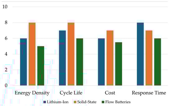 Comparative performance metrics of Li-ion, Solid-state, and Flow Batteries for EV–SG applications.