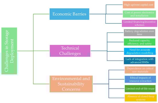 Figure 4 presents a structured overview of the key barriers impacting the large-scale deployment of ESSs within EV–SG integration. These challenges are categorised into three principal domains: economic barriers, technical challenges, and environmental and sustainability concerns. Economic barriers include high upfront capital costs, expenses associated with power electronics and installation, and limited access to favourable financing or incentive schemes. Technical challenges encompass battery degradation over time, reduced capacity and safety, the need for accurate degradation modelling, and a lack of integration with advanced BMSs. Environmental and sustainability concerns focus on the dependence on critical raw materials, ethical issues related to resource extraction, limited reuse at end-of-life, and the current absence of closed-loop recycling systems. Together, these factors underscore the need for holistic approaches that address financial, technological, and ecological dimensions in order to scale storage deployment effectively.