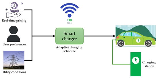 Figure 5 illustrates the architecture of a smart charging system designed to optimise EV charging behaviour in response to multiple dynamic inputs. The smart charger serves as the central control element, processing real-time electricity pricing, user preferences, and prevailing utility grid conditions to generate an adaptive charging schedule. This system enables demand-responsive charging, allowing EVs to draw power at times that are both economically advantageous for users and operationally beneficial for the grid. By integrating wireless communication, the smart charger continuously updates its control logic, responding to fluctuations in energy markets and grid load. The adaptive approach depicted in this figure supports grid stability, enhances the utilisation of renewable energy, and delivers cost savings to end-users while improving the overall efficiency of EV–grid interactions.