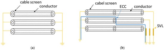 Functional diagrams of the most popular methods of grounding the cable screens of power cables: (a) Both-end bonding (BE); (b) Single-point bonding (SPB) with cable ECC.