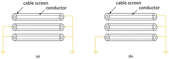 Functional diagrams of variants of cable screens grounding methods: (a) variant a—one-sidedly ungrounded one of the cable screen phases from a three-phase cable line; (b) variant b—one-sidedly ungrounded two of the cable screen phases from a three-phase cable line.