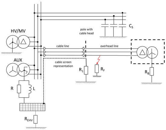 Figure 3 presents a schematic diagram of a section of the power grid, which served as the starting point for creating the simulation model. The grid, assumed as the basic configuration, consists of the power supply section at the HV/MV substation, which houses the HV/MV supply transformer and a grounding transformer with an arc-suppression coil. Furthermore, the substation is equipped with two feeder bays, one of which, the cable-to-overhead line, will be the point for the modifications. The tests will include the voltage waveforms induced in the cable screen and the maximum short-circuit overvoltage level generated in the cable screen of the power cable due to a short circuit occurring near the cable in the overhead line connected with the cable at the cable head. The network simulation model created for the tests is shown in Figure 4.