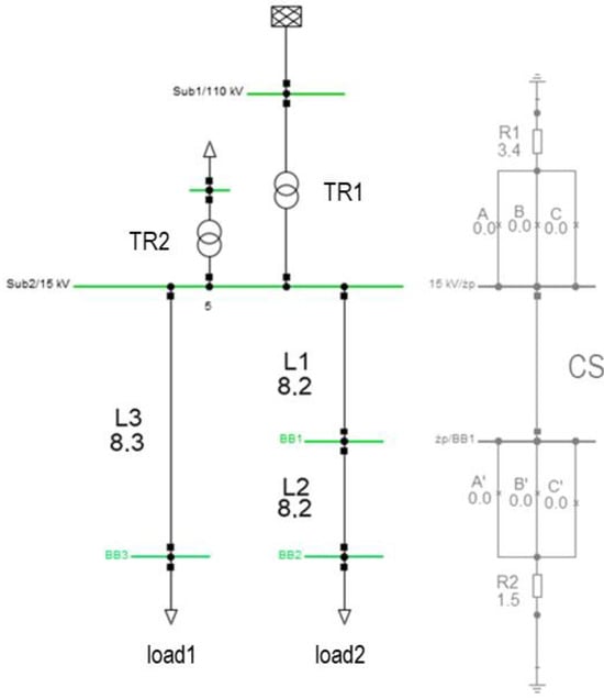 Modeling the grounding configuration of the screens specified in Section 2 of this article was possible by isolating the screen from the cable line and then separating the screen phases in a three-phase system. Each phase, both at the substation connection and at the overhead line connection, was equipped with a switch that allowed the configuration to be changed from a both-end-grounded system to a system with any number of phases ungrounded. The parameters of the power grid model components selected for testing are presented in Table 1. Information regarding the parameters of the network model components was verified using the manufacturers’ catalogs [23,24,25,26].