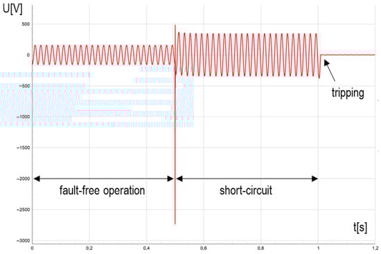 The characteristic value curves obtained from the simulation event were obtained using the Diagrams tool, which allows for the analysis of the variability of the values during the simulation. This solution allowed for the determination of both the maximum overvoltage values occurring during the fault and the nature of the voltage curve during the fault. An example voltage curve for the parameters listed in Table 1 and for the properties of the simulation events described in Table 2 is presented in Figure 5. The model curve was obtained by simulating a ground fault in phase A of an overhead line connected to a cable line operating with both ends bonded. The result is a voltage curve recorded in the cable screen of phase A at the point where the cable line connects to the overhead line, which in a real system would be a cable terminal located on an overhead line pole. In the model, this location is marked as node J. The trace below shows a significant difference between the voltage levels before and after the occurrence of a ground fault, induced in the cable screen, as well as the ground fault overvoltage associated with the occurrence of a ground fault near the grounding of the line pole to which the cable screens are connected.