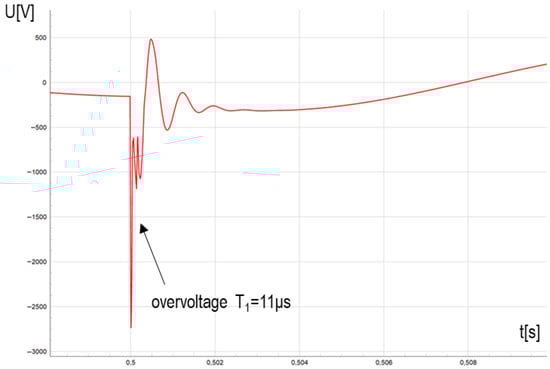 To illustrate the nature of overvoltage occurring in the cable screens of power cables simulated in the program, Figure 6 shows an approximation of a fragment of the example waveform from Figure 5, in which a ground fault overvoltage occurs. According to the literature, this is an internal overvoltage with a steep front and a rise time T1 of less than 20 μs. The attenuation of the overvoltage wave in the system, which results in a reduction in the steepness of the front and amplitude, and consequently a return to a sinusoidal waveform, occurs as a result of resistive attenuation. These result, among other things, from energy losses in the resistance of the conductors or the ground.