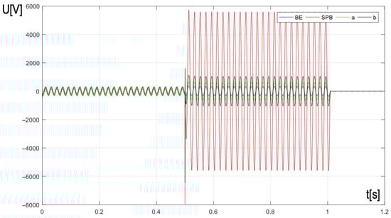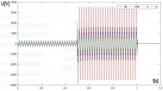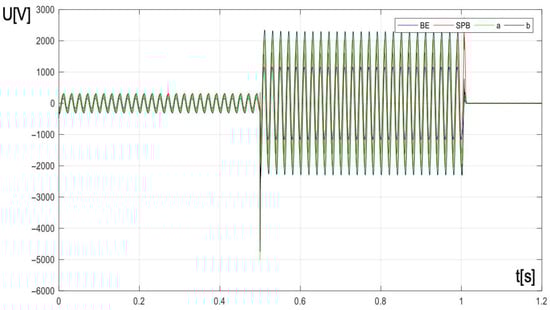 It is also worth noting the voltages induced during a fault, which are presented in the form of selected waveforms from the simulations in Figure 7, Figure 8, Figure 9, Figure 10, Figure 11 and Figure 12. For the SPB method, the voltages during the fault are significantly higher, while for the other configurations, they remain at a similar level in most of the tests.