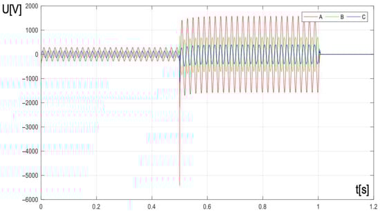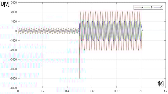 Due to the selection of faults, which are based, among other things, on short circuits in phase B of the modeled overhead cable, Figure 8 and Figure 9 present the waveforms of voltages induced in these phases for both cases of two-phase faults. It can be seen that, depending on the type of fault and the method of grounding the screens, the current flow associated with the fault will change and significantly affect the shape and level of voltages induced in the screens during the fault. As previously assumed, the highest voltage values will occur when the two-phase fault also affects phase A. This case is illustrated in Figure 9.