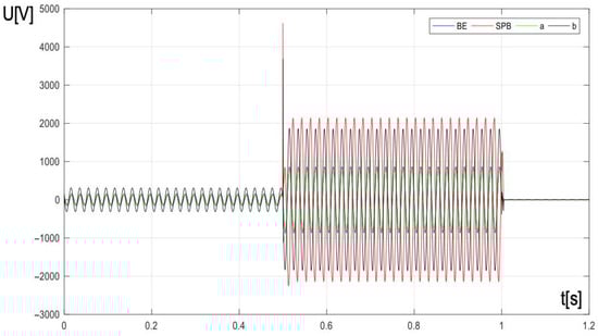 For each of the simulated faults, tests were conducted using four variants of the cable screens grounding method: BE, SPB, and variants a and b described in Section 2. All proposed short circuit types were implemented on an overhead line connected to a cable line in a line bay, a short distance from their connection point. Some of the short circuits selected for testing were phase-to-phase faults, which do not account for current flow in the ground return circuit. Therefore, the voltage induced in the sheaths will be related to the interactions of the cable line’s conductors. The results are presented below in a summary table of the maximum voltages induced in the screens of the three-phase cable line, taking into account the cable screens’ grounding variant. Selected voltage waveforms are also included to illustrate the voltage induced in the cable screens during the simulation.