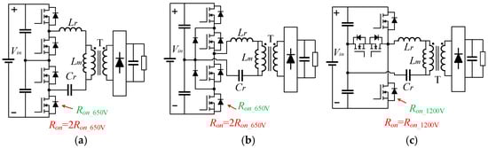 - Ma, W.; Li, H.; Yin, S.; Pang, X.; Chu, D. Design of Hybrid SiC/Si Based T-Type Three-Level LLC Resonant Converter with Wide-Input Range and Low Conduction Loss for Automotive Auxiliary Power Module. IET Power Electron. 2023, 16, 209–226. [Google Scholar] [CrossRef]