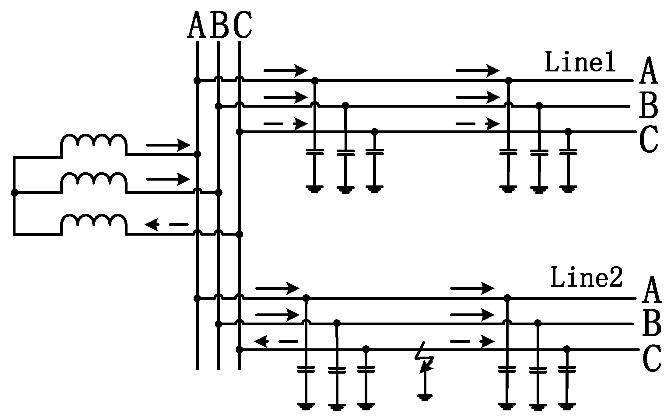 When a single-phase ground fault occurs, a grounding path is formed between the fault point and the earth, giving rise to a fault current. In systems with an ungrounded neutral, the fault current propagates through an asymmetric current distribution across the network, thereby inducing transient zero-sequence currents. The propagation of the fault current follows the characteristics of a transient process, rather than reaching a steady state instantaneously. During this evolution, the magnitude and direction of the zero-sequence currents exhibit noticeable fluctuations. The distribution of zero-sequence current during a single-phase ground fault in a low-current grounding system is illustrated in Figure 1. Here, A, B, and C represent the three-phase lines respectively. When a fault occurs on phase C, the voltage increase on the non-faulty phases causes charging of the capacitance to earth, while the voltage drop on the faulty phase induces discharging of this capacitance. The transient current is the sum of these two components. Due to the uneven impedance distribution across the grid, the current propagation paths are affected by varying impedances, resulting in opposite directions of zero-sequence currents at upstream and downstream nodes.