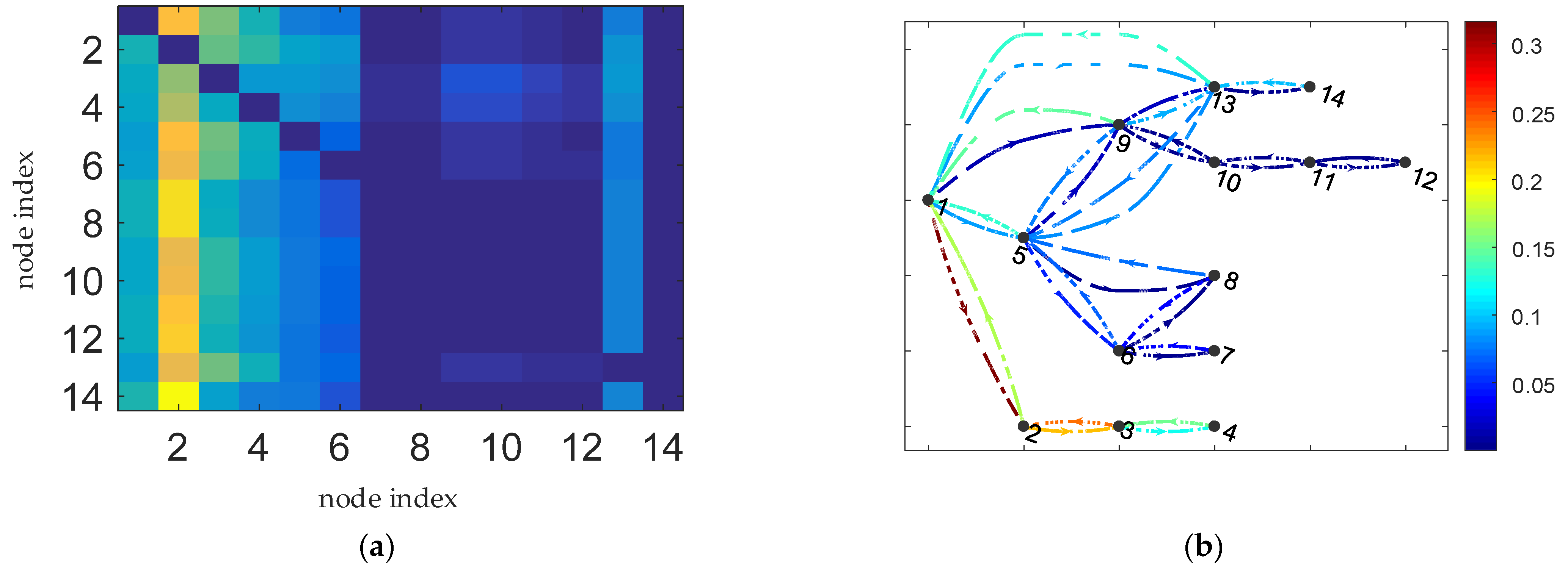 Based on the aforementioned definition, a transfer entropy matrix can be constructed to characterize both the causal strength and directional features of zero-sequence current propagation among nodes in the distribution network. Specifically, under a given fault scenario, transient zero-sequence current data are collected from N measurement nodes, and the transfer entropy T E i j is computed for each node pair ( i , j ) , resulting in an N × N transfer entropy matrix T. Each element T i , j represents the strength of information transfer from node i to node j. Typically, entropy values from upstream to downstream of the fault are higher than those in the reverse direction. As illustrated in Figure 3a, the normalized transfer entropy matrix can be visualized as a two-dimensional heat map, where “high-gradient transition points” closely correspond to the boundaries of fault sections, providing an effective criterion for fault localization. Furthermore, as shown in Figure 3b, when the transfer entropy matrix is overlaid onto the distribution network topology, it effectively forms a directed weighted graph, where the edge weights indicate the direction and magnitude of information propagation paths. Highlighting the segments with higher weights in the diagram will identify the faulty sections.