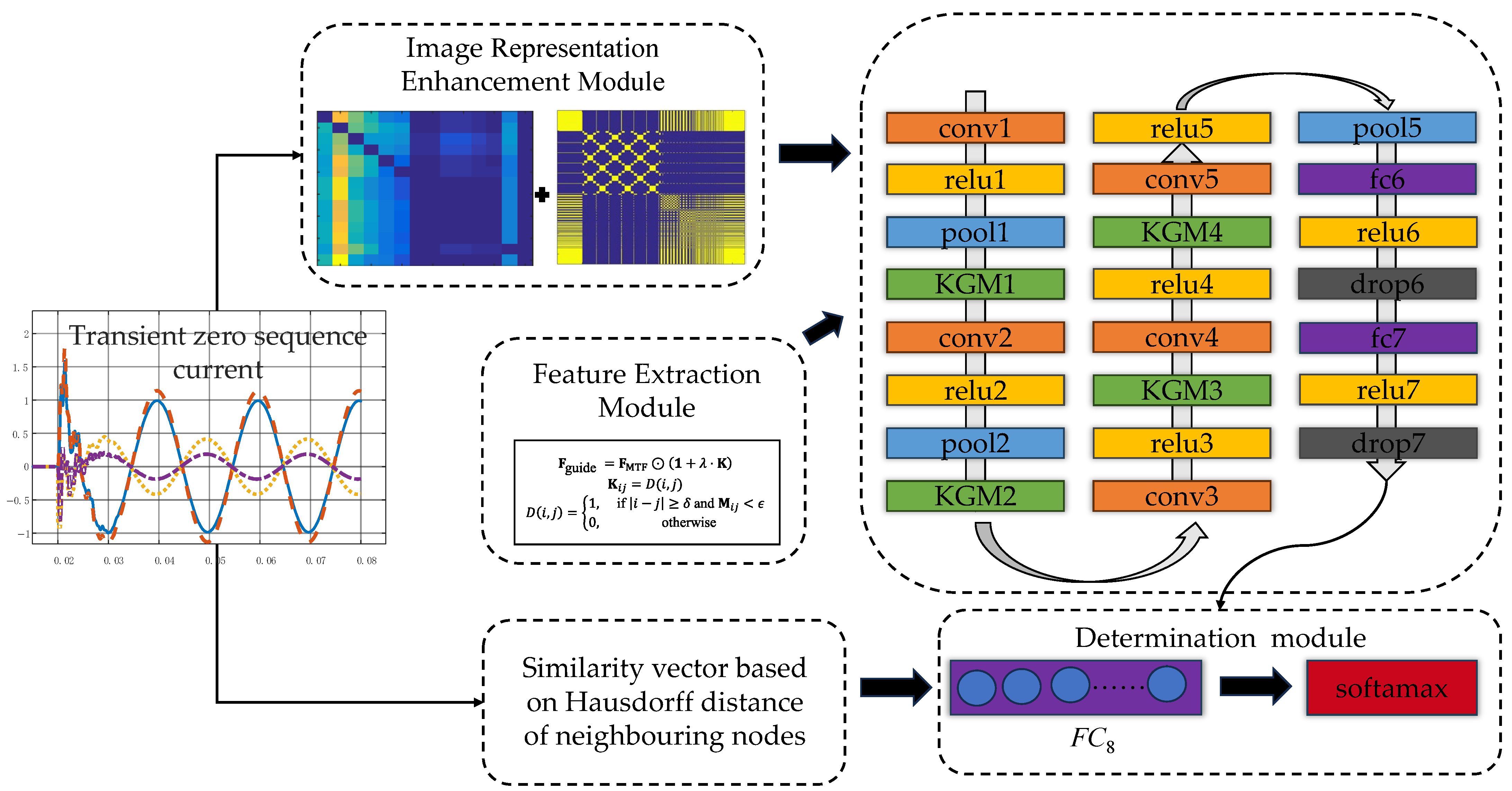 Based on the original convolution layer, this paper designs and introduces the Knowledge-Guided Module (KGM). This module integrates fault mechanisms into the shallow convolutional network and sets higher convolution weights for regions in the network that may be key paths of fault propagation according to the physical law of waveform reverse propagation in the distribution network. Specifically, by analyzing the inversion rules of zero-sequence current amplitude and phase at upstream and downstream nodes of the fault section, a knowledge-guided feature attention module is constructed to explicitly identify regions in the MTF image that may contain key fault information. Through spatial attention weight adjustment, this module guides the network to pay more attention to regions in the image that exhibit structural features such as waveform polarity inversion and mutation boundaries. This process not only improves the effectiveness of network feature extraction but also enhances the physical interpretability of model decisions. In addition, historical fault data is used to conduct offline training on the AlexNet model with the introduced knowledge-enhanced structure, learning the implicit mapping relationship between images and segments, and thereby achieving efficient optimization of feature layer parameters.