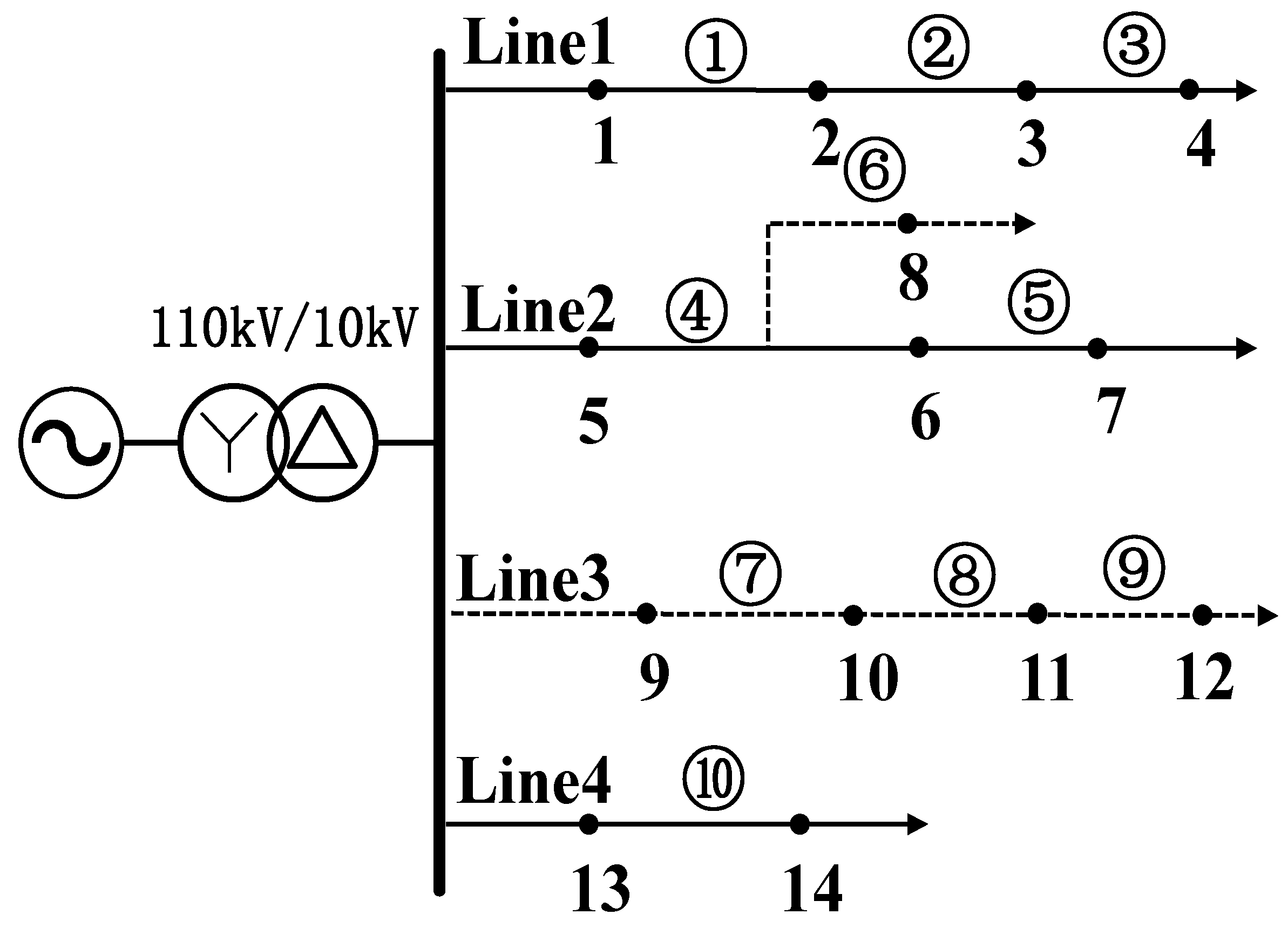 As the terminal link in the power system, the distribution network directly affects the reliability of power supply and the continuity of electricity use for users [1]. With the continuous expansion of the scale of distribution networks in modern society, their complexity and vulnerability have significantly increased. Currently, over 80% of grid faults occur in distribution networks [2,3]. These faults not only disrupt power supply and economic activities but also pose serious threats to public safety and daily life. As a result, many countries and regions have introduced policies and measures to enhance the resilience of distribution systems, including promoting smart grid development, facilitating the integration of distributed renewable energy, and imposing stricter requirements on power supply reliability indicators such as the System Average Interruption Frequency Index (SAIFI) and other power supply reliability metrics, and the objective of fault handling has shifted from ‘sustainable operation for 2 h’ to ‘local isolation of permanent small-current ground faults,’ which imposes higher demands on rapidly locating fault areas. These policy directions highlight the urgency of developing efficient and accurate fault location methods to ensure the stable operation of power systems and meet modern reliability standards. Therefore, rapidly and accurately locating fault sections has become a critical issue that needs to be addressed, especially in large-scale, complex distribution grids where various types of faults coexist, further complicating identification efforts [4].