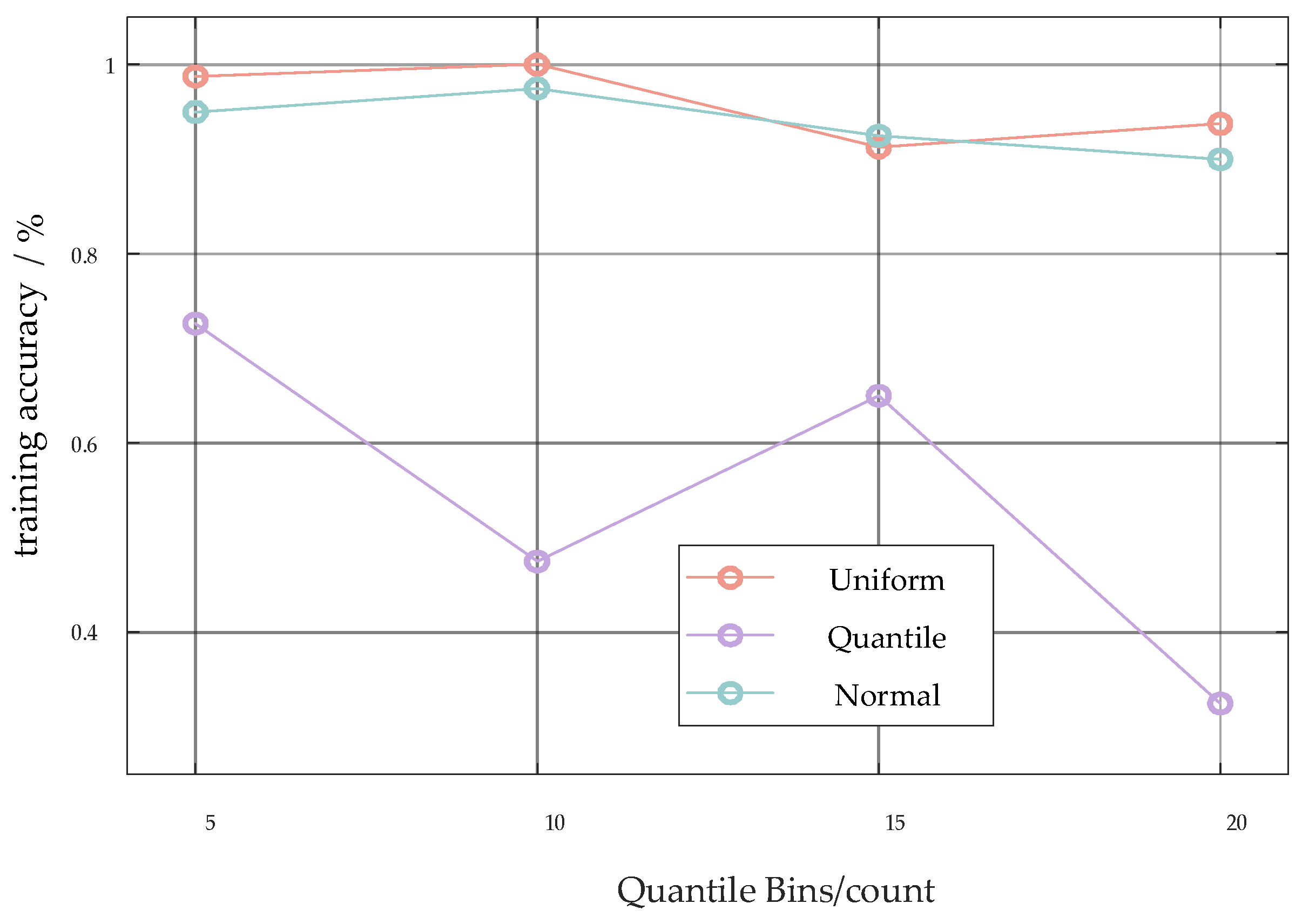 Let the one-dimensional time series of the zero-sequence current associated with a fault be denoted as X = [ x 1 , x 2 , , x T ] T . To enhance the model’s generalizability and stability, the sequence is first normalized to the interval [0,1], then sorted by amplitude and partitioned into Q quantile bins. Common binning strategies include uniform binning, where each bin spans an equal amplitude range; quantile binning, where each bin contains an equal number of data points; and normal binning, where the number of points in each bin follows a normal distribution. The discretized state sequence is denoted as S = [ s 1 , s 2 , , s T ] , where