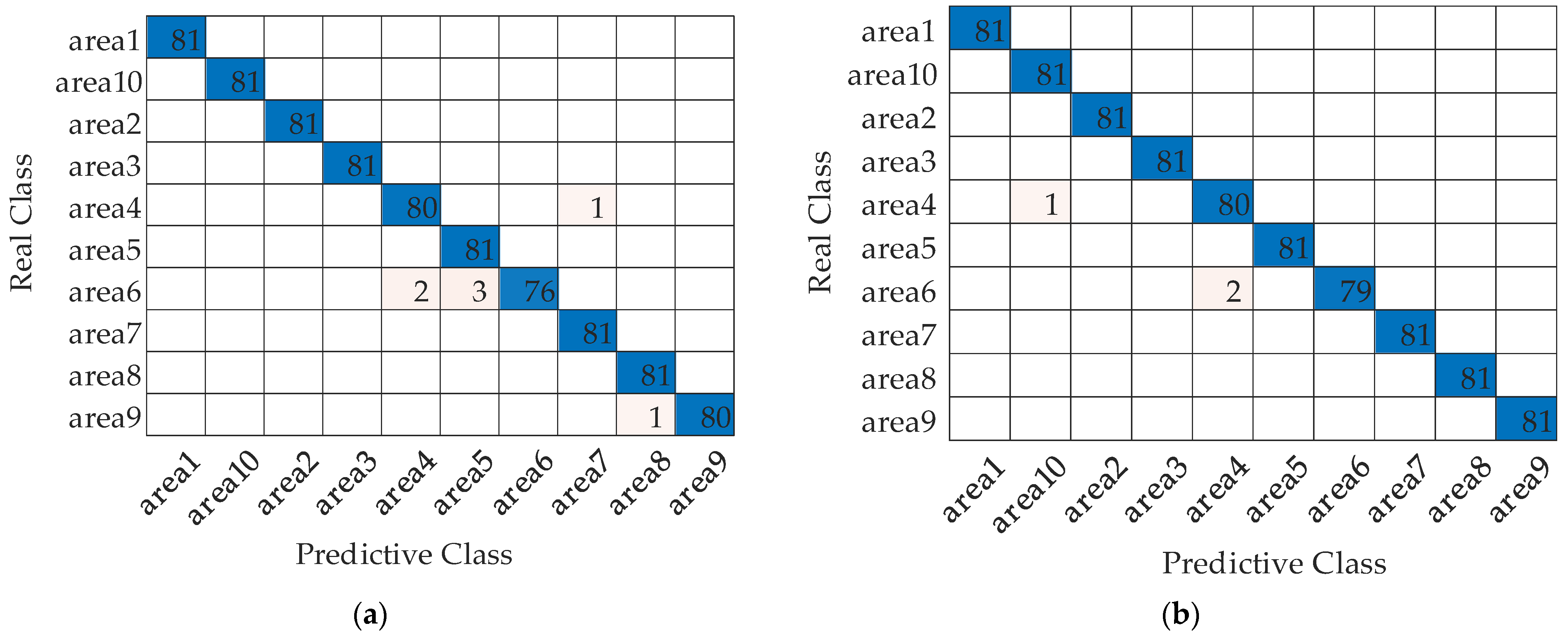 Figure 12. Test set localization confusion matrix for different models: (a) model 1 test set localization results; (b) model 2 test set localization results.