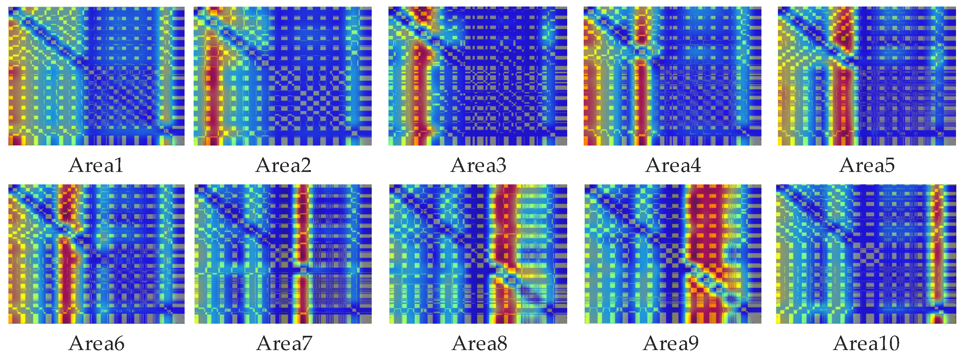 It is worth noting that once the transfer entropy matrix is transformed into a two-dimensional image, its high-value regions exhibit clear physical correspondence with the critical state-transition areas in the MTF image. Specifically, in the MTF representation, cross-node temporal transition patterns are encoded in the off-diagonal sub-blocks between waveform segments from different nodes. Meanwhile, the high-gradient entries in the transfer entropy matrix reflect the intensity of causal relationships between node pairs. When both representations are jointly fed into the model in the image domain, the highlighted regions consistently indicate the primary propagation path of fault disturbances and the key upstream and downstream nodes. These two modalities thus corroborate and complement each other. This multi-perspective information fusion not only enhances the expressiveness of spatiotemporal dependencies in the input data but also provides a physically interpretable and intuitive feature basis for subsequent convolutional kernels to automatically attend to the “fault-source-to-propagation-chain” structure.