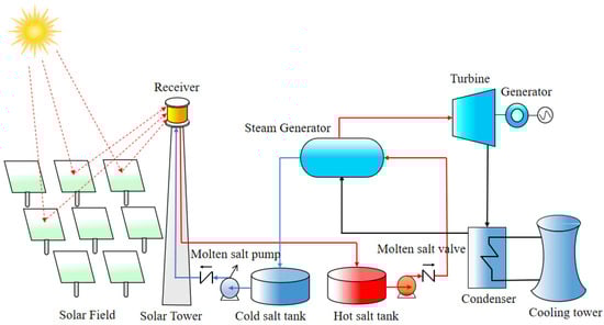 In the context of the “dual carbon” era, the development of low-cost, environmentally friendly new energy to replace traditional fossil energy is of great significance to alleviating the greenhouse effect [1,2]. As a clean and efficient power generation method, solar thermal power generation mainly generates electricity in the form of a tower. Its working principle is to reflect sunlight onto the absorber of the heat absorption tower through a reflector, heating the working medium, binary nitrate, in the absorber. The heated molten salt enters the steam generation system, heats the low-temperature steam in the heat exchanger, and then drives the steam turbine to generate electricity [3]. The high-temperature molten salt regulating valve is a key component of the heat absorption tower and energy storage system. It is installed at the outlet of the absorber and before and after the hot salt tank [4]. It undertakes multi-stage pressure reduction and heat regulation functions and ensures stable operation of the system by controlling the pressure difference and flow. The flow chart of the solar thermal power generation system is shown in Figure 1. Under such large pressure difference and high flow rate conditions, the flow-induced vibration of the valve core movement component of the molten salt regulating valve is easily induced, and resonance is induced in severe cases. Therefore, conducting research on the flow-induced vibration of the valve core assembly of the pilot-operated molten salt regulating valve (hereinafter referred to as the “molten salt regulating valve”) is of great significance to ensuring the safe operation of the tower-type solar thermal power generation system.