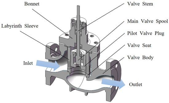Before the numerical simulation, the spring structure was ignored, given its minimal impact on the flow of molten salt within the valve. Furthermore, small structural features such as chamfers and fillets were rationally simplified without affecting the numerical simulation results. The completed three-dimensional solid model is shown in Figure 2. The valve primarily consists of the valve body, valve stem, valve seat, pilot valve core, main valve core, and labyrinth sleeve. The structural dimensions of the main components are shown in Table 2.