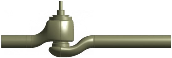 Based on the three-dimensional solid model, the ANSYS 2022R1 DM module was used to establish the flow domain model inside the molten salt regulating valve at openings of 10%, 15%, 20%, 30%, 40%, 50%, 60%, and 70%. In order to accurately simulate the flow field inside the regulating valve, pipes with lengths of 2 times the nominal size and 6 times the nominal size were connected before and after the molten salt regulating valve, respectively [16]. Taking the molten salt regulating valve with an opening of 10% as an example, its flow domain model is shown in Figure 3.
