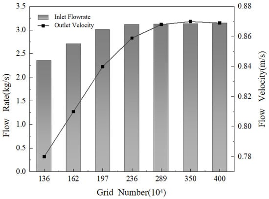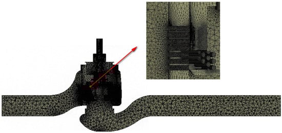 The molten salt regulating valve flow domain model was meshed using an adaptive meshing and local refinement approach. The mesh primarily employed a hybrid of tetrahedral and hexahedral elements. The valve body’s main channel was meshed with tetrahedral elements. Local refinement was performed at the sleeve opening and at locations with mesh transitions, using different mesh sizes. Taking the molten salt regulating valve at 10% opening as an example, the inlet flow rate and average outlet flow velocity calculated using different mesh sizes were compared and analyzed, as shown in Figure 4. Considering accuracy and time efficiency, a mesh size of 2.89 million was used for flow field calculations. After meshing, a rigorous mesh quality check revealed that the orthogonal quality was greater than 0.1, the skewness was less than 0.9, and the average orthogonal quality was 0.81. This mesh fully met the requirements for flow field analysis. The meshing method for the regulating valve flow domain model at other openings remained consistent. The resulting 10% flow domain mesh for the molten salt regulating valve is shown in Figure 5.