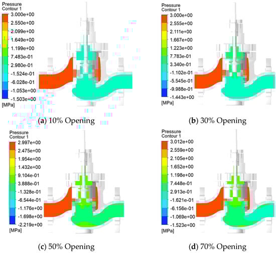 Taking the pressure, velocity, and velocity vorticity cloud diagrams of the molten salt regulating valve at 10%, 30%, 50%, and 70% opening at 0.25 s as an example, the fluid flow characteristics of the valve from 10% to 70% opening are studied, as shown in Figure 6, Figure 7 and Figure 8, respectively.