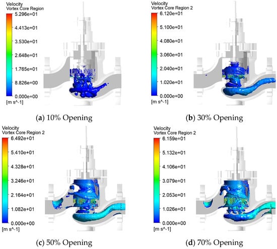 It can be seen from Figure 6, Figure 7 and Figure 8 that when the opening of the molten salt regulating valve increases from 10% to 70%, the local high-pressure area in the pilot valve cavity increases with the increase in the opening, mainly at the bottom of the valve cavity and the connection between the main valve core and the pilot valve core. As the opening increases, the fluid resistance decreases, and the pressure in the throttling area of the pilot valve cavity and the main flow channel after the valve gradually increases. At the same time, as the opening increases, the pressure difference between the pilot valve cavity and the valve after gradually increases; the maximum flow rate is always distributed in the sleeve and the throttling part of the valve core, while the minimum flow rate is distributed in the gap between the valve plug and the valve stem. There is always a vortex phenomenon in the upper cavity of the pilot valve core and the bottom of the valve cavity, and the vortex intensity gradually weakens with the increase in the opening. This is because the flow area of the valve cavity gradually increases with the increase in the opening, but the throttling effect of the sleeve and the valve core is still significant. At this point, vortices are primarily distributed in the upper chamber of the pilot valve core and at the bottom of the valve cavity. However, the widening of the flow path reduces the mainstream velocity gradient, gradually shrinking the spatial distribution of the vortices and weakening the overall disturbance, a phenomenon known as “gradual weakening of the vortex intensity.” At 70% valve opening, no significant vortices exist within the valve cavity, indicating that the flow is relatively stable. The maximum velocity in the vortex core region is located at the inlet of the throttling orifice and increases first and then decreases with increasing valve opening. The vortex core velocity is minimum at 10% opening, reaching 52.96 m/s, and maximum at 50% opening, reaching 64.92 m/s. The enhanced entrainment of high-speed fluid through the orifice causes a temporary increase in the local kinetic energy of the vortex core region, a phenomenon known as “increased vortex core velocity.” However, the vortex’s range of influence has significantly shrunk compared to the 10% opening. From 50% to 70% valve opening, the flow area increases significantly with increasing valve opening, significantly reducing fluid resistance and maintaining a relatively stable flow. At this time, the spatial distribution range of the vortex is further reduced, and even disappears in most areas of the valve cavity, that is, “the vortex intensity continues to weaken”; at the same time, the flow velocity at the throttling hole decreases due to the increase in the flow area, and the suction power of the vortex core is weakened, resulting in “the maximum velocity of the vortex core area decreasing.”