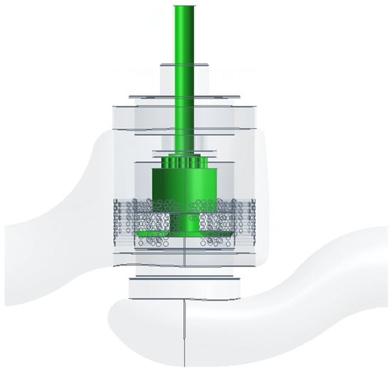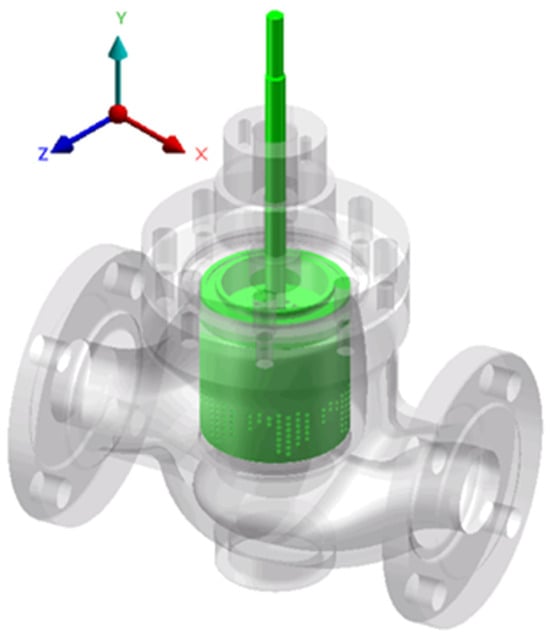 The constructed 3D model of the molten salt regulating valve was imported into the ANSYS Workbench 2022R1 DM module. Reverse modeling was used to generate a model of the valve’s internal fluid domain and define the coupling surface of the valve core assembly’s fluid domain. The resulting fluid–structure interaction numerical analysis model for the molten salt regulating valve is shown in Figure 14.
