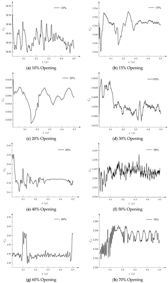 As shown in Figure 10, as the valve opening increases, the pressure inside the valve fluctuates within a certain range over time, exhibiting strong turbulent pulsation characteristics. The maximum pressure pulsation coefficient is 28.92 at 10% opening, 5.70 at 15% opening, 2.66 at 20% opening, 2.46 at 30% opening, 2.65 at 40% opening, 2.48 at 50% opening, 2.63 at 60% opening, and 2.27 at 70% opening. The above analysis shows that the pressure pulsation coefficient is maximum at a 10% opening. This is because at this opening, due to the small flow area, the fluid forms a high-speed jet at the throttling point, which induces a significant backflow vortex inside the valve cavity. At the same time, the backflow vortex interacts strongly with the valve cavity wall, exacerbating local pressure fluctuations and, in turn, maintaining a high pressure pulsation coefficient (Cp) at this opening. As the molten salt regulating valve opening increases, the pressure pulsation coefficient tends to stabilize at around 2.5.