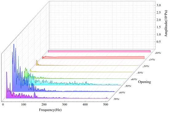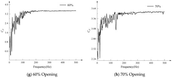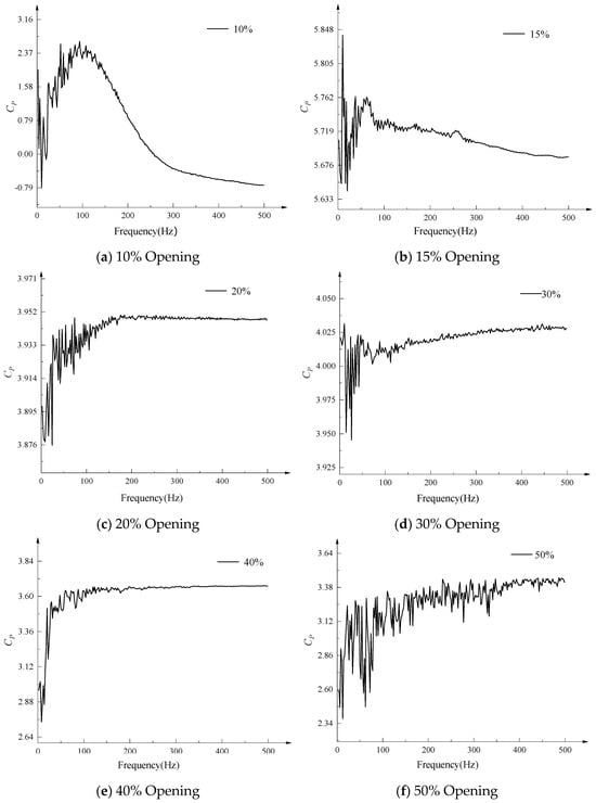 Time domain analysis can provide a preliminary analysis of pressure pulsation information, but under the same parameters, time domain analysis often cannot meet the requirements. Therefore, the pressure pulsation signal is further processed using frequency domain analysis. Through fast Fourier transform, the frequency domain curve of the pressure pulsation coefficient of the valve core monitoring surface at different openings is obtained, as shown in Figure 11.
