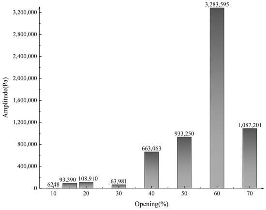 Based on the frequency domain distribution of pressure pulsation at different openings of the molten salt regulating valve, the main peak value of pressure pulsation at each opening was extracted to quantify the intensity characteristics of the fluid excitation force at different openings. The extracted pressure pulsation peak distribution is shown in Figure 13.